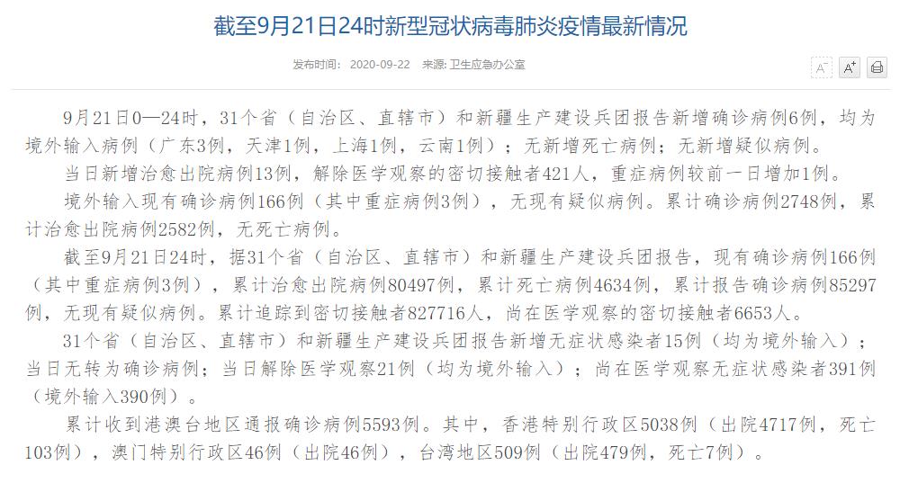 情況顯示,截至9月21日24時,據(jù)31個?。ㄗ灾螀^(qū)、直轄市)和新疆生產(chǎn)建設(shè)兵團報告,現(xiàn)有確診病例166例(其中重癥病例3例),累計治愈出院病例80497例,累計死亡病例4634例,累計報告確診病例85297例,無現(xiàn)有疑似病例。累計追蹤到密切接觸者827716人,尚在醫(yī)學(xué)觀察的密切接觸者6653人。