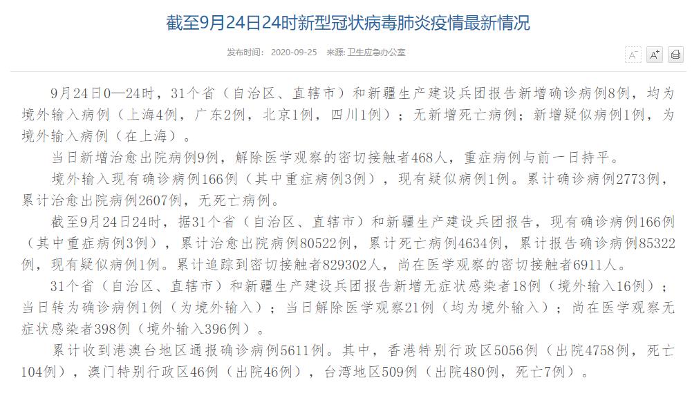 人民網(wǎng)北京9月25日電(董童)國(guó)家衛(wèi)生健康委于今日在官網(wǎng)發(fā)布的《截至9月24日24時(shí)新型冠狀病毒肺炎疫情最新情況》(以下簡(jiǎn)稱(chēng)“情況”)顯示,9月24日0—24時(shí),31個(gè)?。ㄗ灾螀^(qū)、直轄市)和新疆生產(chǎn)建設(shè)兵團(tuán)報(bào)告新增確診病例8例,均為境外輸入病例(上海4例,廣東2例,北京1例,四川1例);無(wú)新增死亡病例;新增疑似病例1例,為境外輸入病例(在上海)。當(dāng)日新增治愈出院病例9例,解除醫(yī)學(xué)觀察的密切接觸者468人,重癥病例與前一日持平。