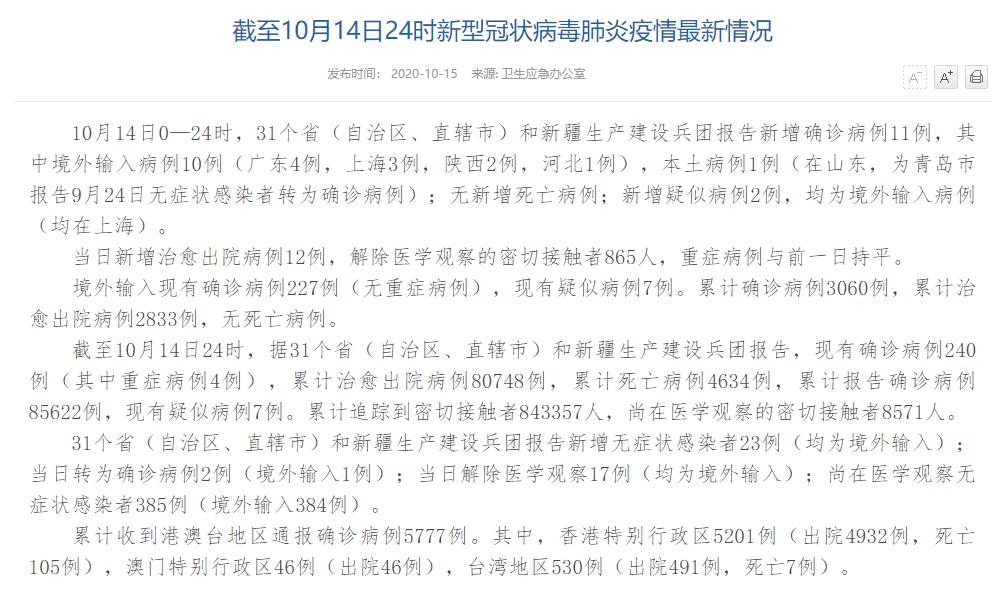 人民網(wǎng)北京10月15日電(董童)國家衛(wèi)生健康委于今日在官網(wǎng)發(fā)布的《截至10月14日24時新型冠狀病毒肺炎疫情最新情況》(以下簡稱“情況”)提出,10月14日0—24時,31個?。ㄗ灾螀^(qū)、直轄市)和新疆生產(chǎn)建設(shè)兵團報告新增確診病例11例,其中境外輸入病例10例(廣東4例,上海3例,陜西2例,河北1例),本土病例1例(在山東,為青島市報告9月24日無癥狀感染者轉(zhuǎn)為確診病例);無新增死亡病例;新增疑似病例2例,均為境外輸入病例(均在上海)。當(dāng)日新增治愈出院病例12例,解除醫(yī)學(xué)觀察的密切接觸者865人,重癥病例與前一日持平。