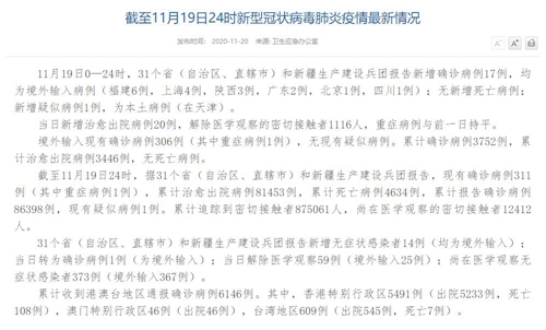 人民網(wǎng)北京11月20日電(董童)國(guó)家衛(wèi)生健康委于今日在官網(wǎng)發(fā)布的《截至11月19日24時(shí)新型冠狀病毒肺炎疫情最新情況》(以下簡(jiǎn)稱(chēng)“情況”)提出,11月19日0—24時(shí),31個(gè)?。ㄗ灾螀^(qū)、直轄市)和新疆生產(chǎn)建設(shè)兵團(tuán)報(bào)告新增確診病例17例,均為境外輸入病例(福建6例,上海4例,陜西3例,廣東2例,北京1例,四川1例);無(wú)新增死亡病例;新增疑似病例1例,為本土病例(在天津)。當(dāng)日新增治愈出院病例20例,解除醫(yī)學(xué)觀察的密切接觸者1116人,重癥病例與前一日持平。