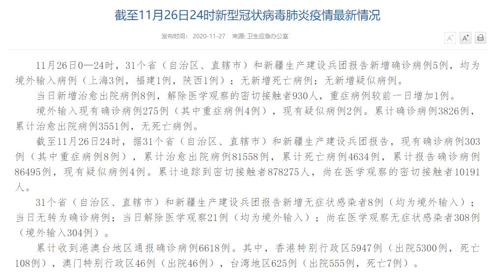人民網(wǎng)北京11月27日電(董童)國家衛(wèi)生健康委于今日在官網(wǎng)發(fā)布的《截至11月26日24時新型冠狀病毒肺炎疫情最新情況》(以下簡稱“情況”)指出,11月26日0—24時,31個省(自治區(qū)、直轄市)和新疆生產(chǎn)建設(shè)兵團報告新增確診病例5例,均為境外輸入病例(上海3例,福建1例,陜西1例);無新增死亡病例;無新增疑似病例。當(dāng)日新增治愈出院病例8例,解除醫(yī)學(xué)觀察的密切接觸者930人,重癥病例較前一日增加1例。
