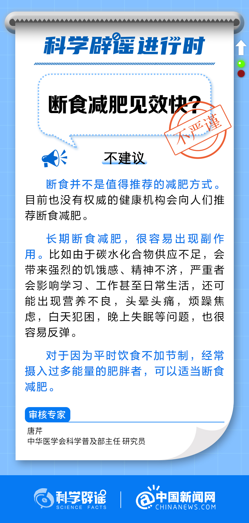 中新網(wǎng)12月26日電 斷食并不是值得推薦的減肥方式。目前也沒有權威的健康機構(gòu)會向人們推薦斷食減肥。長期斷食減肥,很容易出現(xiàn)多種副作用。(來源:@科學辟謠 中國新聞網(wǎng)微博)