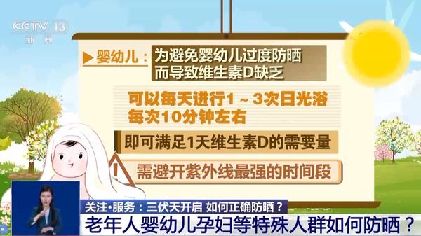 嬰幼兒:為了避免嬰幼兒過度防曬而導(dǎo)致維生素D缺乏,可以每天進行1至3次日光浴,每次10分鐘左右,即可滿足1天維生素D的需要量,但需避開紫外線最強的時間段。小于6個月的嬰兒不建議使用防曬產(chǎn)品,大于6個月的嬰幼兒建議以“硬防曬”為主。即使涂抹了防曬產(chǎn)品,也不宜在強烈陽光下活動。 (總臺央視記者 李斌 楊曉剛 鄢俊琪 孔冰冰) (責(zé)任編輯:梁艷) |