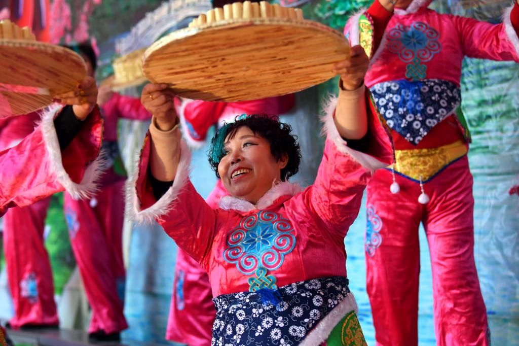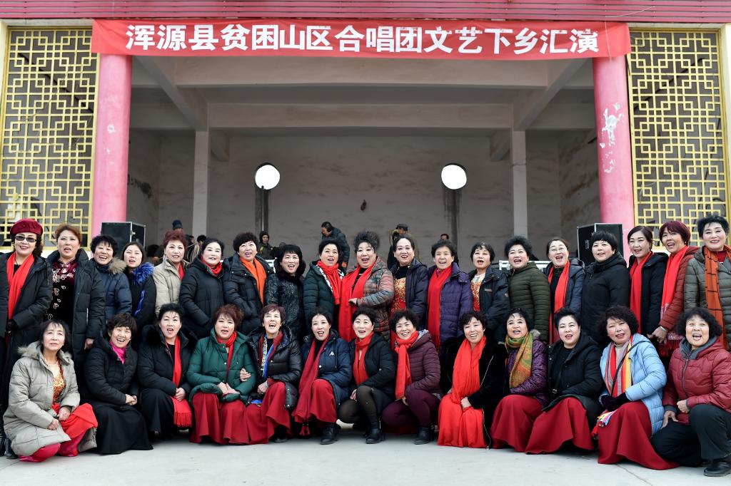 ↑1月3日,在山西省渾源縣荊莊村,渾源縣貧困山區(qū)合唱團(tuán)在表演歌舞《看山看水看中國(guó)》。