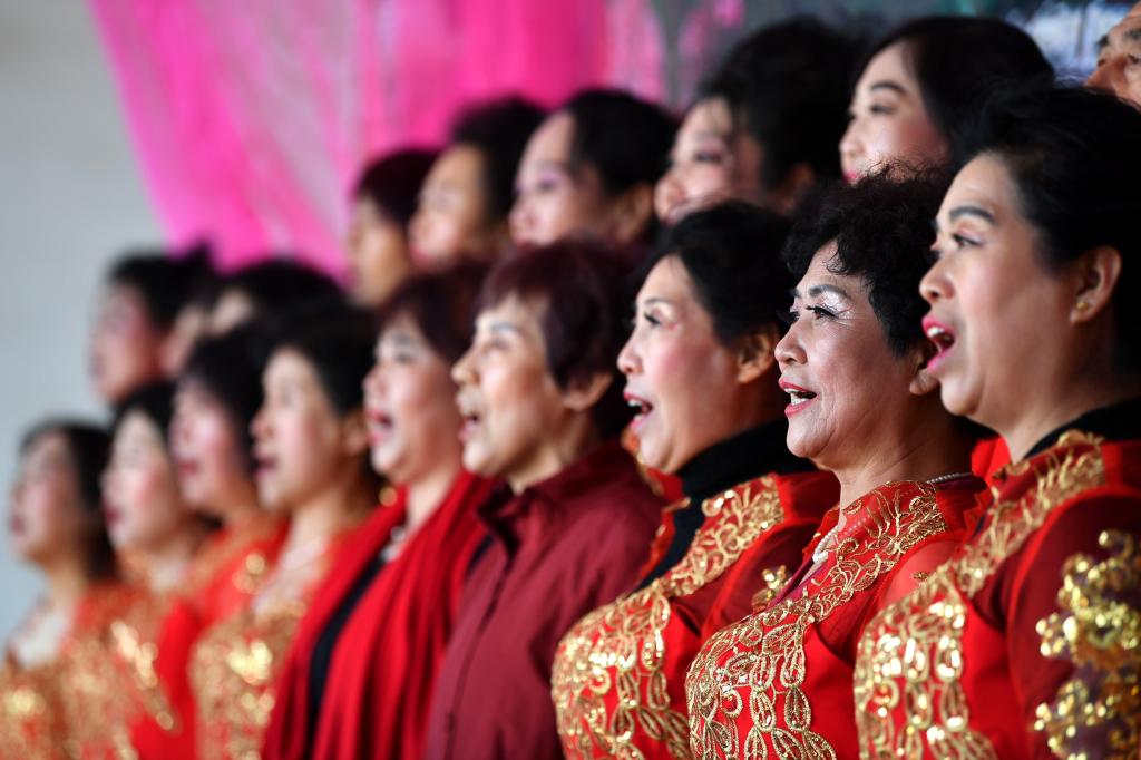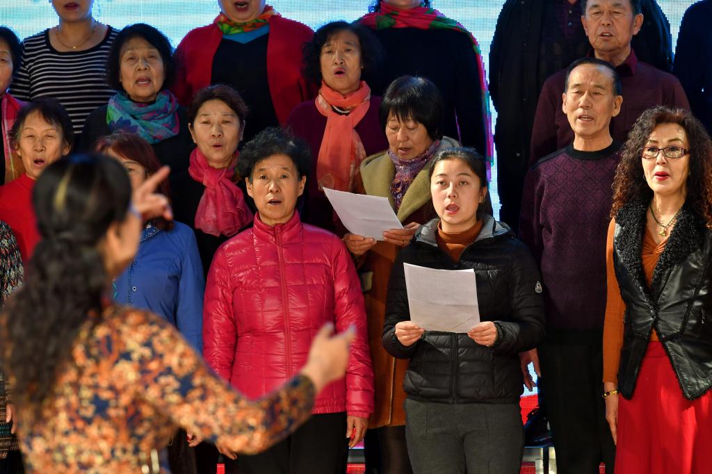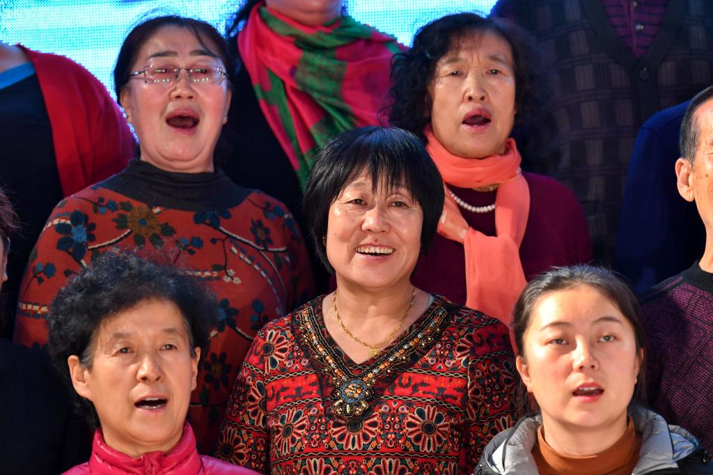 ↑1月3日,在山西省渾源縣荊莊村,渾源縣貧困山區(qū)合唱團(tuán)在表演大合唱《祝福祖國(guó)》。