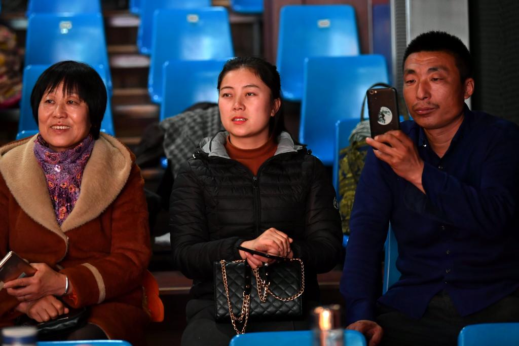 ↑1月3日,在山西省渾源縣荊莊村,村民們?cè)谛蕾p渾源縣貧困山區(qū)合唱團(tuán)的演出。