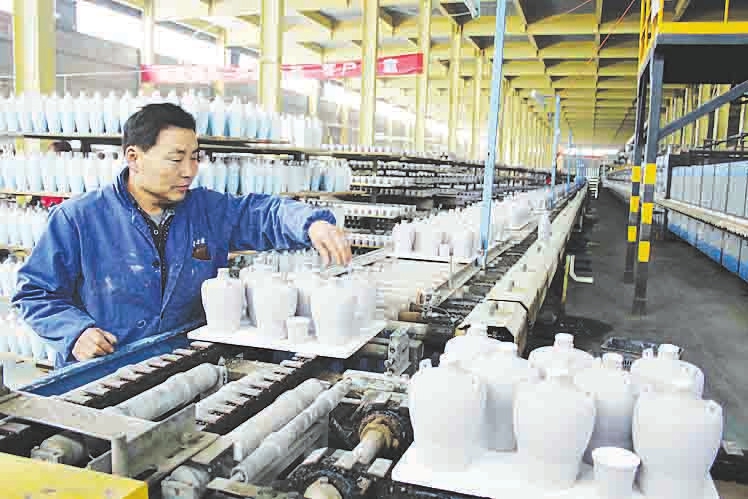 4月7日,位于陽城縣町店鎮(zhèn)五龍溝陶瓷工業(yè)園區(qū)的晉城市晉陶陶瓷公司工人正在加緊生產(chǎn)汾酒酒瓶。今年一季度,該公司生產(chǎn)各類酒瓶酒具200萬支,再創(chuàng)歷史同期最高水平。尹春雷 攝