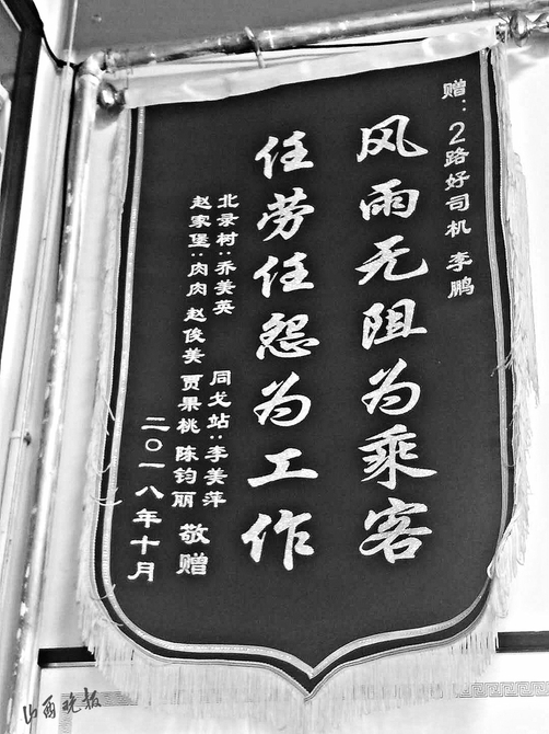 撿到東西歸還失主,失主送來表揚信比較常見,山西晚報記者發(fā)現(xiàn)有一張比較例外。一位署名“2路乘客”的感謝信中這樣寫道:“2017年以前,可以說偶爾坐2路,因為經(jīng)常會有等不上車的情況。但自從李鵬接上2路以后,基本上沒出現(xiàn)過等不上車的情況……作為長期乘坐公交的乘客真心非常感謝……”錦旗是7名乘客集體送的,“風(fēng)雨無阻為乘客,任勞任怨為工作”,14個字,表達的是乘客對李鵬的認(rèn)可。
