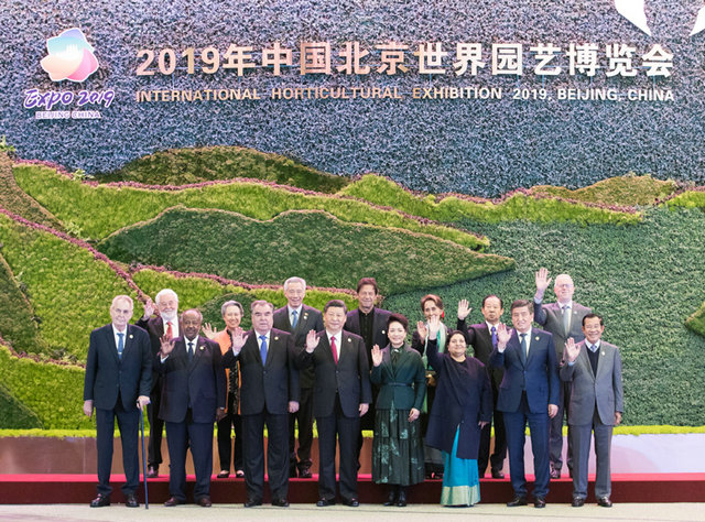 4月28日,國(guó)家主席習(xí)近平在北京延慶出席2019年中國(guó)北京世界園藝博覽會(huì)開幕式,并發(fā)表題為《共謀綠色生活,共建美麗家園》的重要講話。這是開幕式前,習(xí)近平和夫人彭麗媛同參加開幕式的外方領(lǐng)導(dǎo)人集體合影。新華社記者 黃敬文 攝