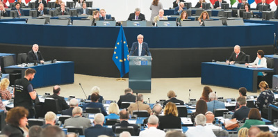 2018年9月12日,歐盟委員會主席容克(中)在法國斯特拉斯堡歐洲議會發(fā)表“盟情咨文”。主題為“歐洲主權(quán)時刻”,強調(diào)歐洲需要在塑造全球事務(wù)中發(fā)揮作用,包括提升歐元的國際地位等。(新華社/法新社)
