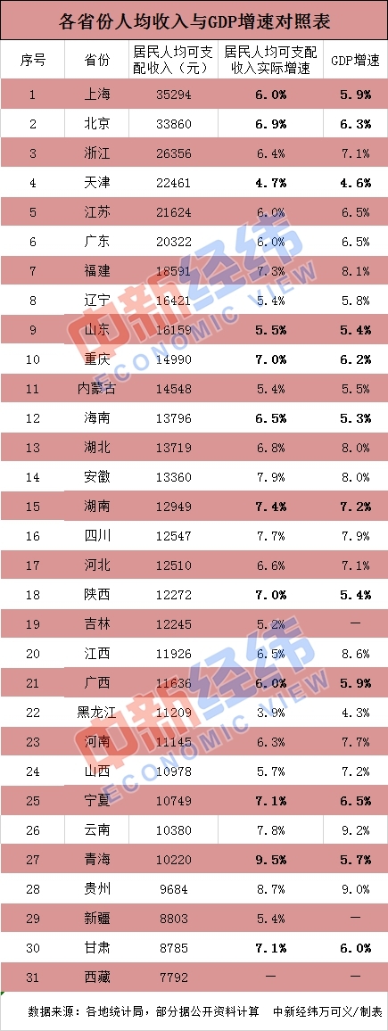 中新經(jīng)緯客戶端梳理發(fā)現(xiàn),2019年上半年,上海、北京、天津、山東、重慶、海南、湖南、陜西、廣西、寧夏、青海、甘肅等12省份居民人均可支配收入的實際增速超過了當?shù)氐腉DP增速。其中青海人均可支配收入實際增速比GDP高了3.8個百分點,陜西人均可支配收入實際增速比GDP高了1.6個百分點。
