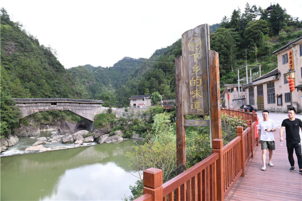 下黨村新修的木棧道旁樹立了“下鄉(xiāng)的味道”品牌標識(8月8日攝)。新華社記者 林善傳 攝