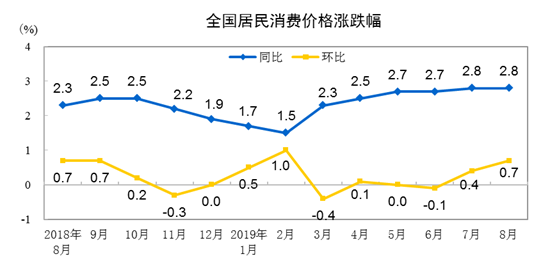 人民網(wǎng)北京9月10日電 (楊曦)國家統(tǒng)計(jì)局今日公布數(shù)據(jù)顯示,2019年8月份,全國居民消費(fèi)價(jià)格(CPI)同比上漲2.8%,與上月持平;8月份CPI環(huán)比上漲0.7%,漲幅略有擴(kuò)大。1——8月平均,CPI同比上漲2.4%。