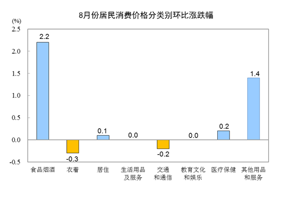 8月份,CPI環(huán)比上漲0.7%,漲幅比上月擴(kuò)大0.3個百分點(diǎn)。其中,城市上漲0.6%,農(nóng)村上漲1.0%;食品價(jià)格上漲3.2%,非食品價(jià)格上漲0.1%;消費(fèi)品價(jià)格上漲1.1%,服務(wù)價(jià)格上漲0.2%。
