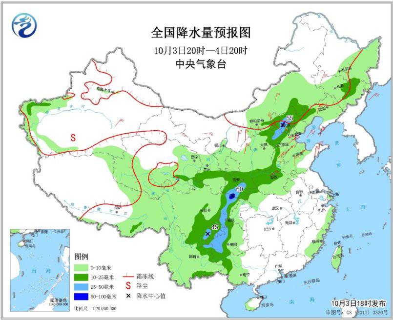 10月3日20時(shí)至4日20時(shí),內(nèi)蒙古東南部、河北北部、北京西部、西北地區(qū)東南部、黃淮西部、西南地區(qū)東部等地的部分地區(qū)有中到大雨,其中,陜西南部、四川盆地東北部等地的局地有暴雨(50~60毫米)。內(nèi)蒙古大部、華北東部、東北地區(qū)東部、黃淮東部等地的部分地區(qū)有4~6級(jí)風(fēng)(見圖3)。