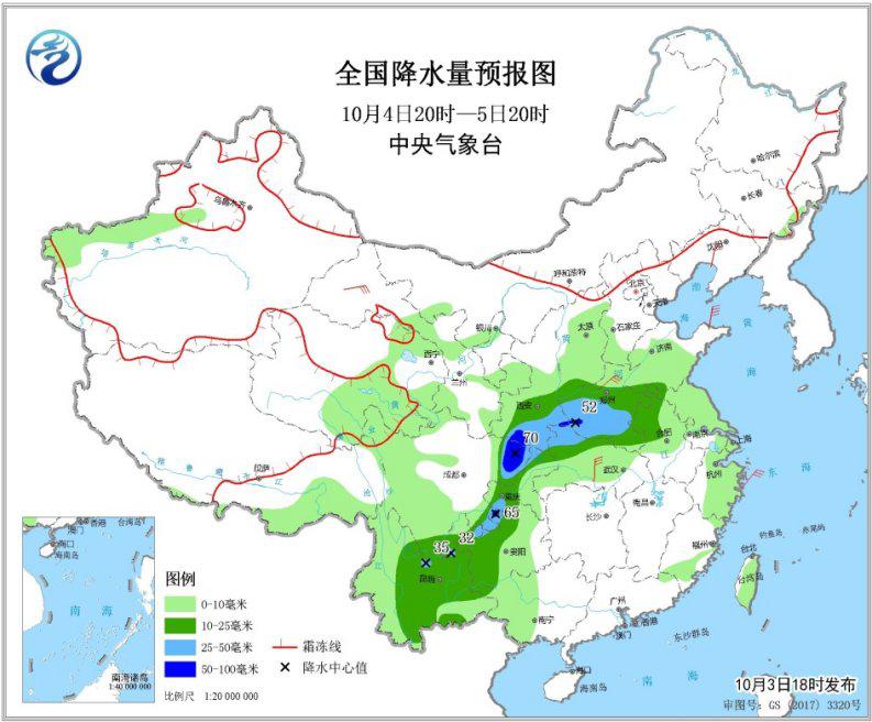 10月4日20時(shí)至5日20時(shí),西北地區(qū)東南部、黃淮西部、江淮西北部、江漢北部、西南地區(qū)東部和南部等地的部分地區(qū)有中到大雨,陜西南部、河南西部、四川盆地東北部等地局地有暴雨(50~70毫米)。遼寧中部、甘肅河西、河南北部、湖北中部等地的部分地區(qū)有5~6級(jí)風(fēng)(見圖4)。