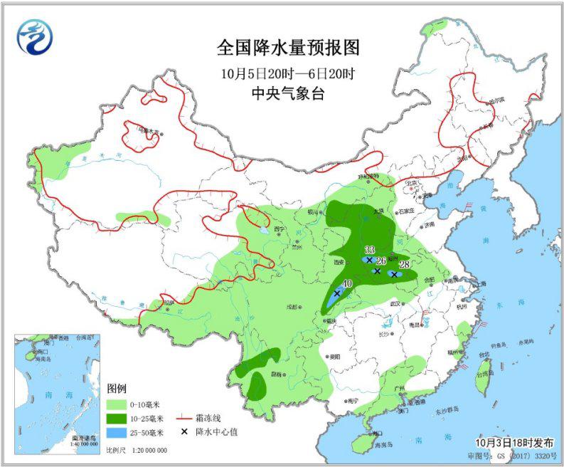 10月5日20時(shí)至6日20時(shí),西藏東部、西北地區(qū)中東部、華北中西部、黃淮西部、江漢西部、西南地區(qū)大部、華南中南部、臺(tái)灣島等地的部分地區(qū)有小到中雨,陜西南部、河南南部和西部、四川盆地東北部等地局地有大雨(25~40毫米)。江西北部部分地區(qū)有5~6級(jí)風(fēng)(見圖5)。