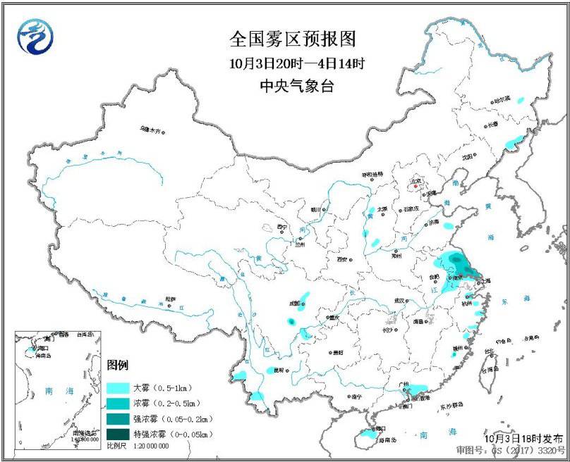 受冷空氣和降水共同影響,全國(guó)大部地區(qū)大氣擴(kuò)散和清除條件較好。僅在4日至5日,新疆南疆盆地、甘肅西部以及內(nèi)蒙古西部等地的部分地區(qū)有揚(yáng)沙或浮塵天氣。此外,3日夜間至4日早晨,江蘇大部、浙江東部、安徽東部等地的部分地區(qū)有大霧,局地能見度不足200米,中央氣象臺(tái)于10月3日18時(shí)發(fā)布大霧預(yù)報(bào)(見圖2)。
