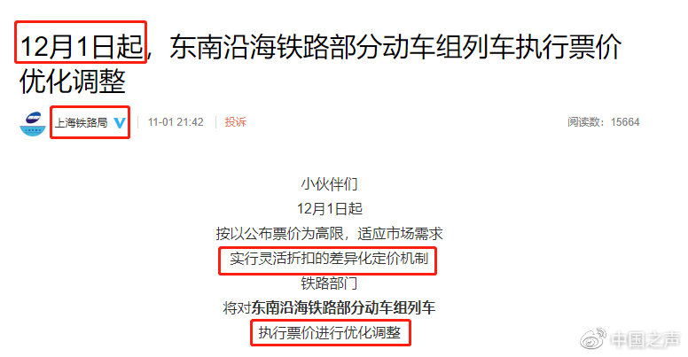 據(jù)中國(guó)之聲報(bào)道: “雙十一”將至,這兩天,一條“高鐵”也要參加“雙十一”的消息引發(fā)不少人的關(guān)注。近期,上海、成都、蘭州、廣州、南寧等鐵路局集團(tuán)公司陸續(xù)發(fā)布消息,將要對(duì)票價(jià)進(jìn)行調(diào)整。當(dāng)然,說(shuō)高鐵參加“雙十一”只是個(gè)玩笑話。首先,這調(diào)價(jià)可不是從11月11號(hào)開(kāi)始;其次,雖然最高折扣達(dá)到5.5折,但總體來(lái)看,票價(jià)有升有降,可不是一味“搞促銷”。