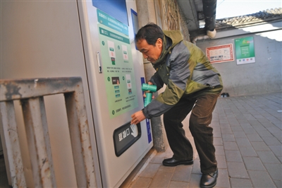 大乘巷教師宿舍院,一位居民通過機(jī)器領(lǐng)取廚余垃圾袋。攝影/新京報(bào)記者 吳江