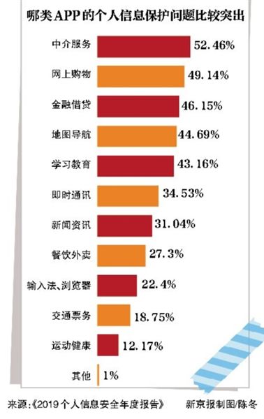 新京報(bào)記者注意到,此次通報(bào)涉及的APP包含多個(gè)行業(yè)。根據(jù)《2019個(gè)人信息安全年度報(bào)告》,普通用戶認(rèn)為中介服務(wù)類、網(wǎng)上購(gòu)物類、金融借貸類APP的個(gè)人信息保護(hù)問題最為突出。