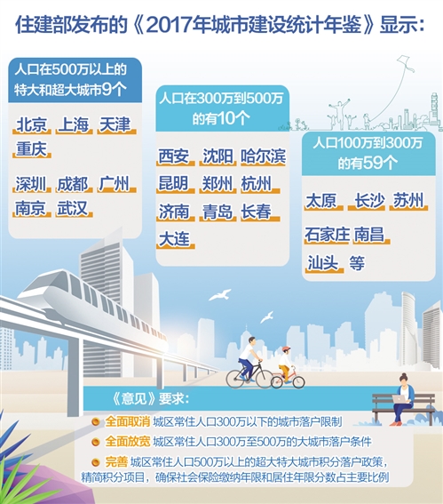 武漢大學中國發(fā)展戰(zhàn)略與規(guī)劃研究院副院長吳傳清認為,這與今年4月國家發(fā)展改革委發(fā)布的《2019年新型城鎮(zhèn)化建設(shè)重點任務(wù)》相互呼應(yīng),并更加深化?!吨攸c任務(wù)》提出,繼續(xù)加大戶籍制度改革力度,在此前城區(qū)常住人口100萬以下的中小城市和小城鎮(zhèn)已陸續(xù)取消落戶限制的基礎(chǔ)上,城區(qū)常住人口100萬至300萬的Ⅱ型大城市要全面取消落戶限制;城區(qū)常住人口300萬至500萬的Ⅰ型大城市要全面放開放寬落戶條件,并全面取消重點群體落戶限制。超大特大城市要調(diào)整完善積分落戶政策,大幅增加落戶規(guī)模、精簡積分項目,確保社保繳納年限和居住年限分數(shù)占主要比例。