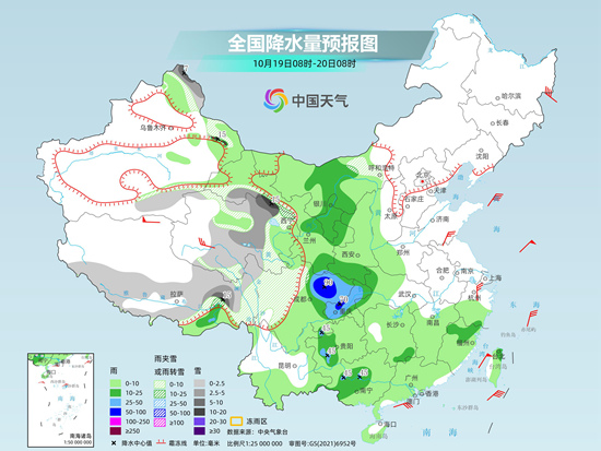 在冷空氣和降水的疊加影響下,19日至21日,長江中下游沿線及其以北地區(qū)氣溫將大面積創(chuàng)新低,最高氣溫的最低值將普遍跌至20°C以下,最低氣溫0°C線將南壓至內(nèi)蒙古中部、河北北部一線。