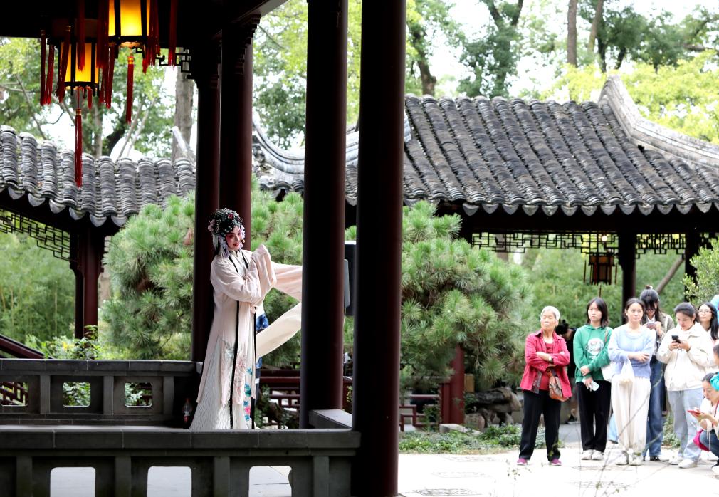 10月19日,演員在蘇州虎丘山景區(qū)為游客表演昆曲。新華社發(fā)(杭興微 攝)