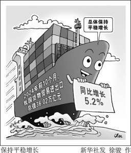 據(jù)新華社電 海關(guān)總署7日發(fā)布數(shù)據(jù)顯示,2024年前10個(gè)月,我國(guó)貨物貿(mào)易進(jìn)出口總值36.02萬億元,同比增長(zhǎng)5.2%,總體保持平穩(wěn)增長(zhǎng)。