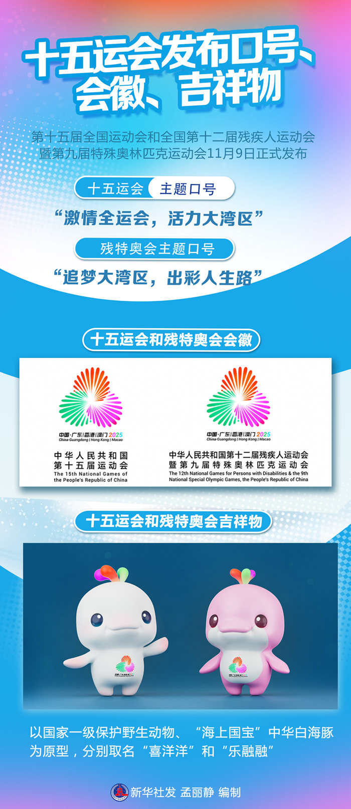 新華社廣州11月9日電(記者王浩明)第十五屆全國(guó)運(yùn)動(dòng)會(huì)和全國(guó)第十二屆殘疾人運(yùn)動(dòng)會(huì)暨第九屆特殊奧林匹克運(yùn)動(dòng)會(huì)9日正式發(fā)布主題口號(hào)、會(huì)徽、吉祥物。十五運(yùn)會(huì)主題口號(hào)為“激情全運(yùn)會(huì),活力大灣區(qū)”,殘?zhí)貖W會(huì)主題口號(hào)為“追夢(mèng)大灣區(qū),出彩人生路”。