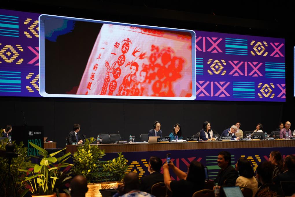 12月4日,在巴拉圭亞松森聯(lián)合國教科文組織保護(hù)非物質(zhì)文化遺產(chǎn)政府間委員會第19屆常會評審現(xiàn)場,大屏幕播放春節(jié)宣傳視頻。新華社記者 朱雨博 攝