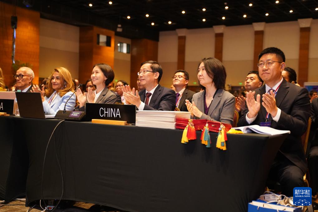 12月4日,在巴拉圭亞松森拍攝的聯(lián)合國教科文組織保護(hù)非物質(zhì)文化遺產(chǎn)政府間委員會第19屆常會評審現(xiàn)場,中國代表團(tuán)慶祝春節(jié)申遺成功。新華社記者 朱雨博 攝
