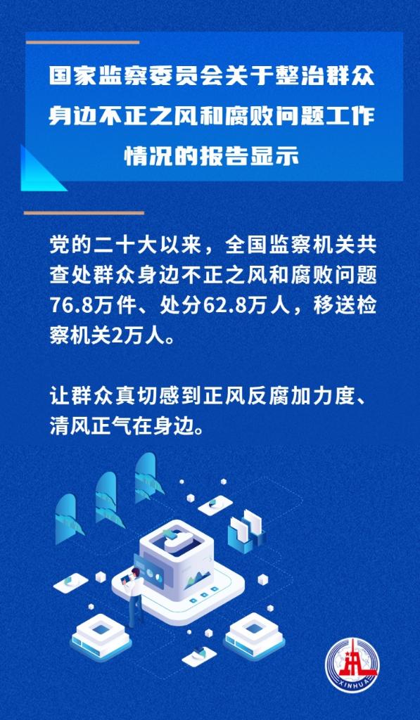 黨的二十大以來(lái),全國(guó)監(jiān)察機(jī)關(guān)查處群眾身邊不正之風(fēng)和腐敗問(wèn)題76.8萬(wàn)件、處分62.8萬(wàn)人,移送檢察機(jī)關(guān)2萬(wàn)人……