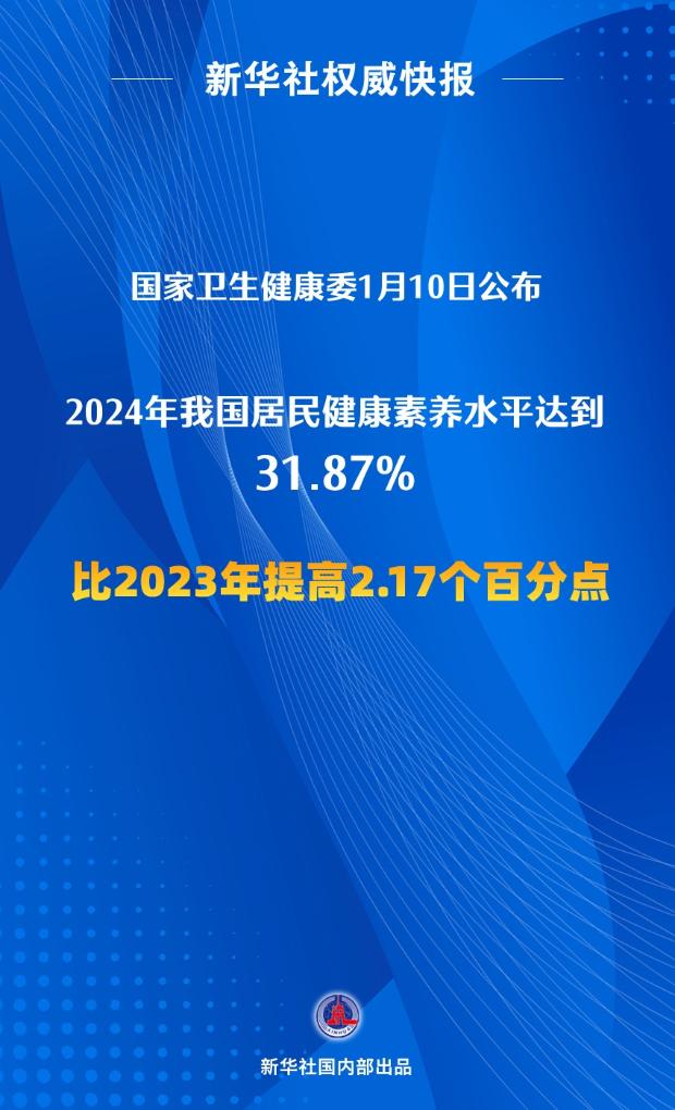 記者1月10日從國家衛(wèi)生健康委了解到,2024年我國居民健康素養(yǎng)水平達(dá)到31.87%,比2023年提高2.17個百分點(diǎn)。