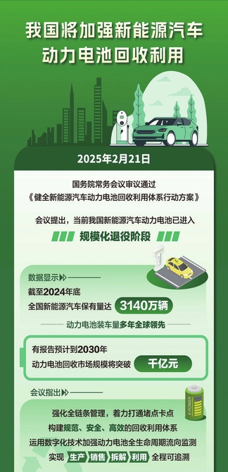 21日召開(kāi)的國(guó)務(wù)院常務(wù)會(huì)議,審議通過(guò)《健全新能源汽車動(dòng)力電池回收利用體系行動(dòng)方案》。會(huì)議指出,當(dāng)前我國(guó)新能源汽車動(dòng)力電池已進(jìn)入規(guī)?;艘垭A段,全面提升動(dòng)力電池回收利用能力水平尤為重要。 工業(yè)和信息化部節(jié)能與綜合利用司有關(guān)負(fù)責(zé)人說(shuō),加強(qiáng)新能源汽車動(dòng)力電池回收利用,對(duì)支撐新能源汽車產(chǎn)業(yè)高質(zhì)量發(fā)展、保障國(guó)家資源安全、減少環(huán)境污染和安全隱患具有重要意義。 中國(guó)工業(yè)節(jié)能與清潔生產(chǎn)協(xié)會(huì)副會(huì)長(zhǎng)李力說(shuō),會(huì)議對(duì)健全新能源汽車動(dòng)力電池回收利用體系作出部署,釋放出加快發(fā)展新能源汽車動(dòng)力電池回收利用產(chǎn)業(yè)的鮮明信號(hào)。 此前,工業(yè)和信息化部發(fā)布《新能源汽車廢舊動(dòng)力電池綜合利用行業(yè)規(guī)范條件(2024年本)》,以更好適應(yīng)技術(shù)水平提升、技術(shù)指標(biāo)提高的行業(yè)發(fā)展趨勢(shì),引導(dǎo)企業(yè)有序投資、有序發(fā)展,進(jìn)一步加強(qiáng)新能源汽車廢舊動(dòng)力電池綜合利用行業(yè)管理。 會(huì)議要求,要用法治化手段規(guī)范回收利用,制定完善相關(guān)行政法規(guī),加強(qiáng)監(jiān)督管理。要加快制定修訂動(dòng)力電池綠色設(shè)計(jì)、產(chǎn)品碳足跡核算等相關(guān)標(biāo)準(zhǔn),以標(biāo)準(zhǔn)引領(lǐng)帶動(dòng)回收利用。 李力說(shuō),會(huì)議從加強(qiáng)頂層設(shè)計(jì)、強(qiáng)化標(biāo)準(zhǔn)研制等方面對(duì)新能源汽車動(dòng)力電池回收利用提出了明確要求,有利于進(jìn)一步凝聚各方共識(shí),規(guī)范行業(yè)秩序,讓監(jiān)管有法可依有據(jù)可循。 工業(yè)和信息化部表示,將聚焦廢舊動(dòng)力電池等新興固體廢物,加快健全法規(guī)政策,完善回收和綜合利用體系,促進(jìn)安全高效循環(huán)利用。(文圖均據(jù)新華社) (責(zé)任編輯:蔡文斌) |