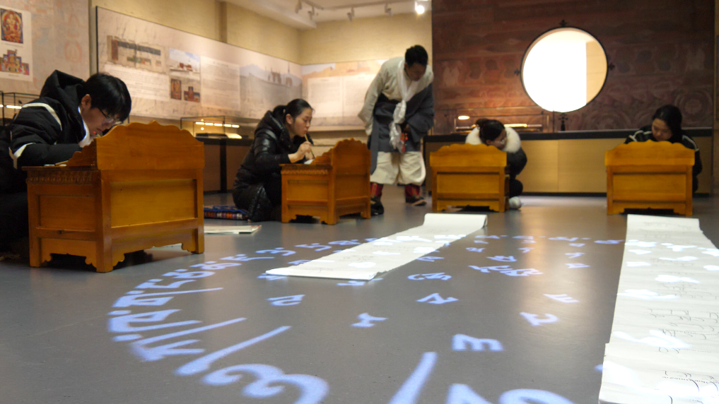 2月28日是藏歷新年初一,市民和游客在西藏博物館展廳參加藏文書法互動體驗活動(2月28日攝)。新華社記者吳思思 攝