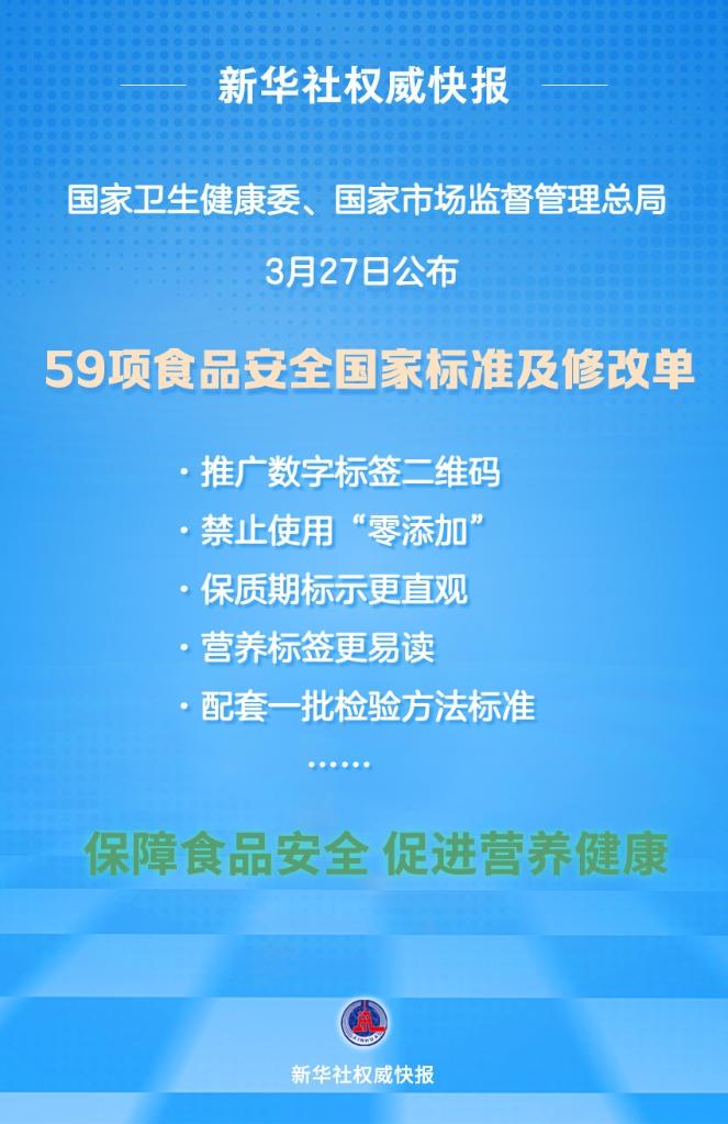 新華社北京3月27日電題:禁用“零添加”!食品安全新國(guó)標(biāo)亮相 新華社記者董瑞豐、李恒 “零添加”真的不含添加物嗎?鹽油糖該如何避免過(guò)量攝入? 國(guó)家衛(wèi)生健康委、國(guó)家市場(chǎng)監(jiān)督管理總局27日公布59項(xiàng)食品安全國(guó)家標(biāo)準(zhǔn)及修改單。消費(fèi)者特別關(guān)心的“零添加”、食物過(guò)敏、鹽油糖標(biāo)示等內(nèi)容,均有明確規(guī)定,旨在進(jìn)一步提升食品安全保障水平,維護(hù)公眾健康,促進(jìn)食品產(chǎn)業(yè)高質(zhì)量發(fā)展。