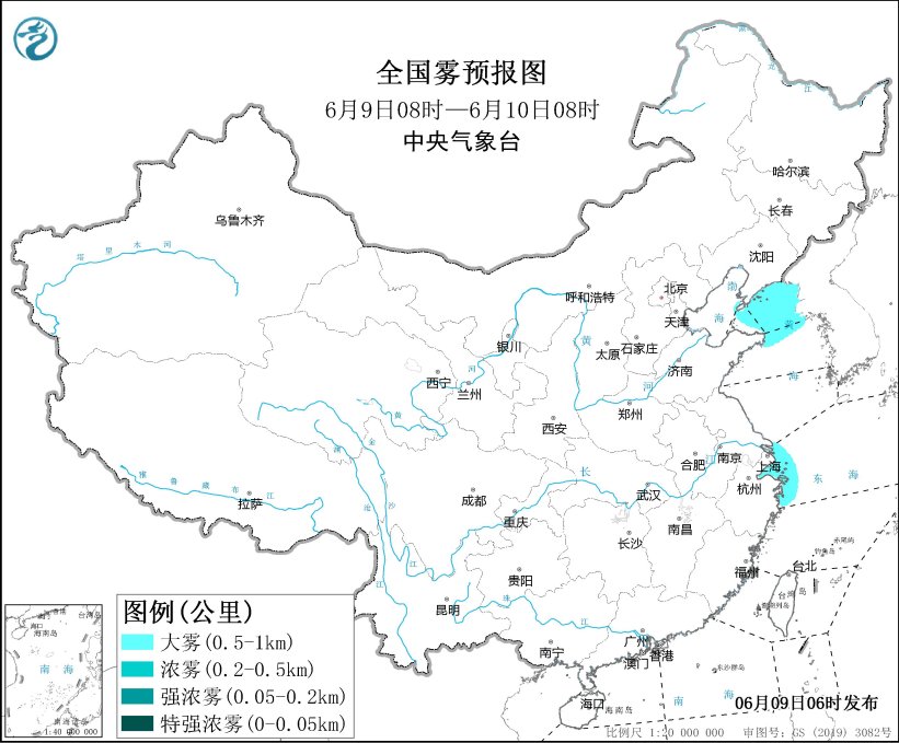 預(yù)計6月9日白天至夜間,渤海海峽、黃海北部海域、遼東半島東部沿岸海域、成山頭附近海域、長江口及杭州灣附近海域、舟山群島附近海域、大連港、上海港、寧波港將有能見度不足1公里的大霧。