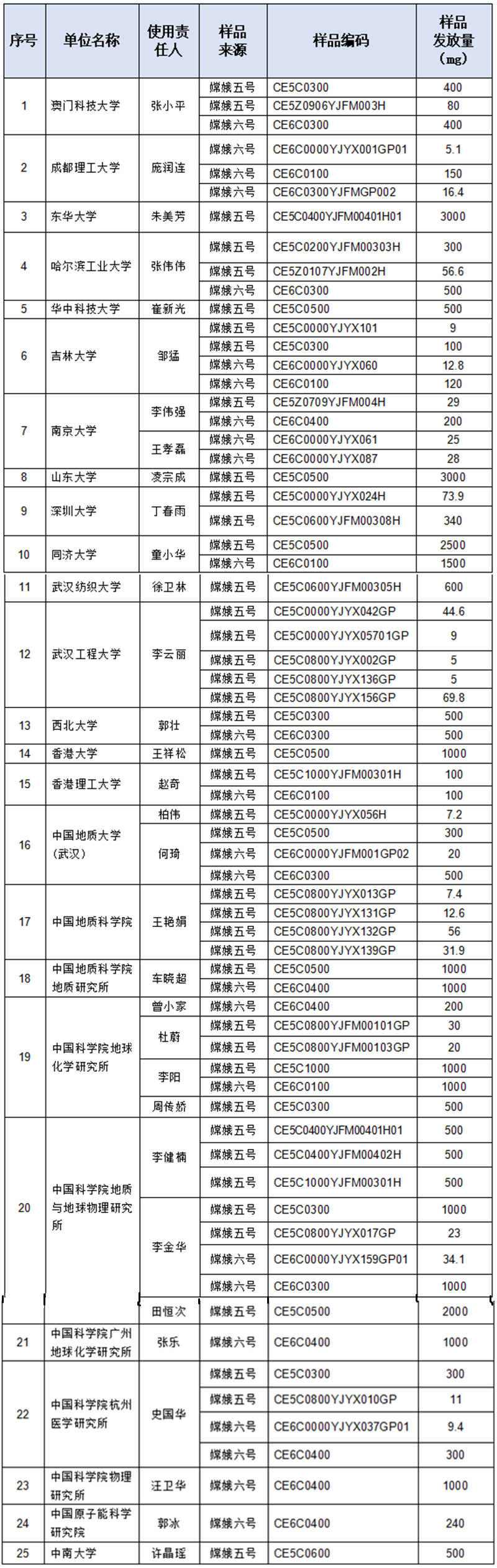 8月2日,中國探月工程發(fā)布關(guān)于發(fā)放國內(nèi)第九批月球科研樣品的公告。2025年7月,探月與航天工程中心組織召開了第九批月球科研樣品借用申請評審會。經(jīng)月球樣品專家委員會評審,探月與航天工程中心審核并報國家航天局批準,最終25家科研機構(gòu)的67份申請獲得通過,對應(yīng)32名使用責任人,樣品發(fā)放量共計30881.8mg。