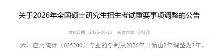 6月11日,中央民族大學(xué)發(fā)布《關(guān)于2026年全國(guó)碩士研究生招生考試重要事項(xiàng)調(diào)整的公告》,明確規(guī)定:應(yīng)用統(tǒng)計(jì)(025200)專業(yè)的學(xué)制從2026年開(kāi)始由2年調(diào)整為3年。