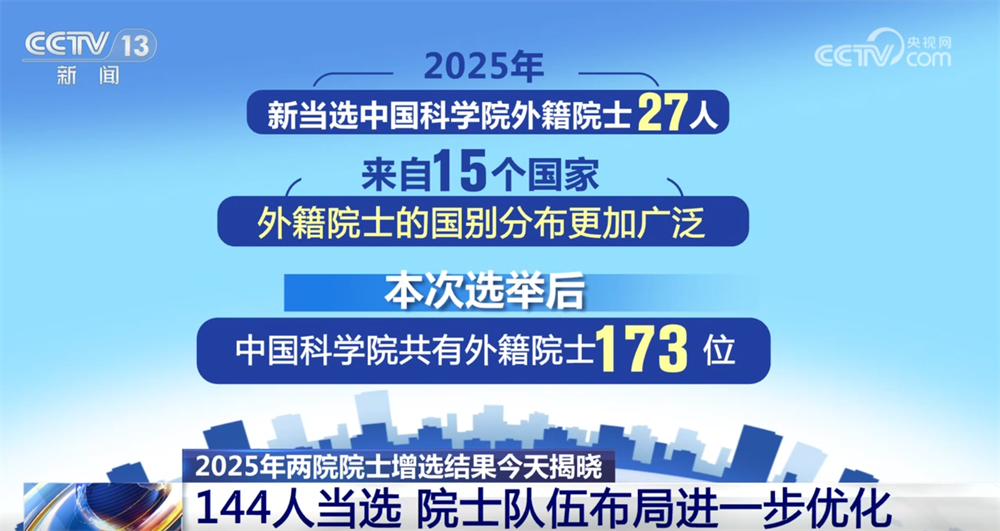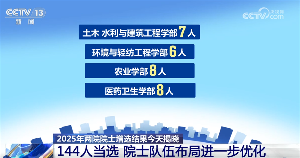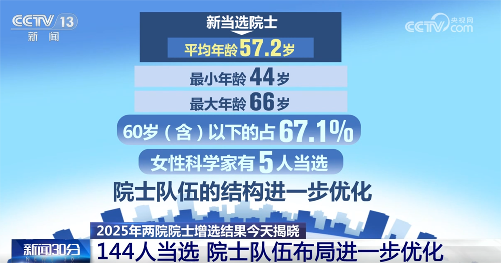 央視網消息:11月21日,2025年兩院院士增選結果正式揭曉,共有144人當選,院士隊伍的年齡結構、學科、地區(qū)和行業(yè)布局進一步優(yōu)化。
