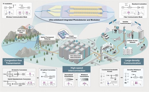為此,北京大學聯(lián)合鵬城實驗室、上??萍即髮W、國家信息光電子創(chuàng)新中心等研發(fā)團隊,創(chuàng)出“光纖—無線一體化融合通信”概念,并采用集成光學方案,成功研制出250GHz(千兆赫茲)以上超寬帶集成光子器件。在此基礎上開發(fā)出的新系統(tǒng)實現(xiàn)了光纖通信單通道512Gbps(千兆比特每秒)信號傳輸、無線通信單通道400Gbps信號傳輸。