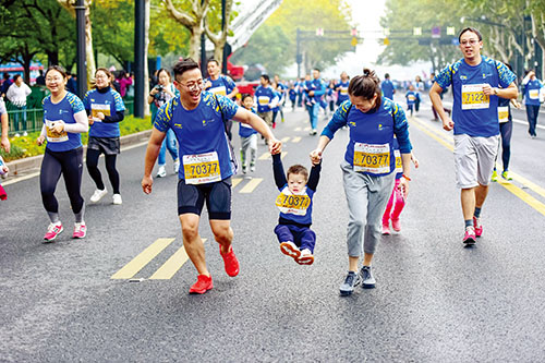 11月4日,多地舉辦馬拉松比賽,眾多長(zhǎng)跑愛(ài)好者參與其中,享受運(yùn)動(dòng)帶來(lái)的快樂(lè)。圖為家長(zhǎng)帶著孩子參加浙江杭州舉行的馬拉松比賽。據(jù)新華社 徐暉 攝