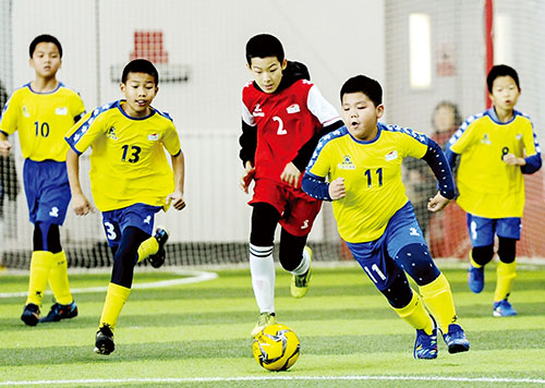 11月18日,2018年新疆維吾爾自治區(qū)首屆體育產(chǎn)業(yè)杯青少年足球聯(lián)賽在新疆國際會展中心圣丹亞體育運動球場鳴哨開賽。此次足球聯(lián)賽邀請了來自烏魯木齊市、新疆昌吉回族自治州部分中小學及俱樂部共14支代表隊參加。圖為新疆農(nóng)大附中代表隊球員(前)與昌吉足協(xié)代表隊球員在U12比賽中。據(jù)新華社 記者 王菲 攝