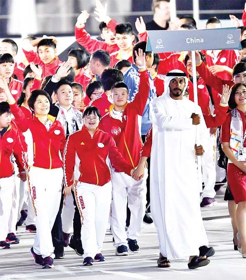 3 月14 日,李想(中)與自己的偶像、前奧運冠軍李小鵬(前排右五)隨中國代表團(tuán)在2019 年阿布扎比夏季特奧會開幕式上入場。