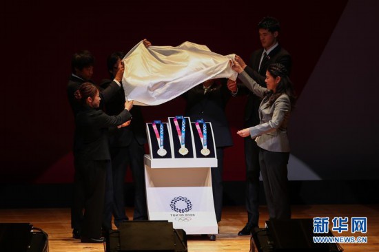7月24日,在2020年東京奧運(yùn)會(huì)倒計(jì)時(shí)一周年儀式現(xiàn)場(chǎng),嘉賓揭曉東京奧運(yùn)會(huì)獎(jiǎng)牌。 當(dāng)日,在2020年東京奧運(yùn)會(huì)倒計(jì)時(shí)一周年之際,東京奧組委公開獎(jiǎng)牌設(shè)計(jì)。 新華社記者杜瀟逸攝