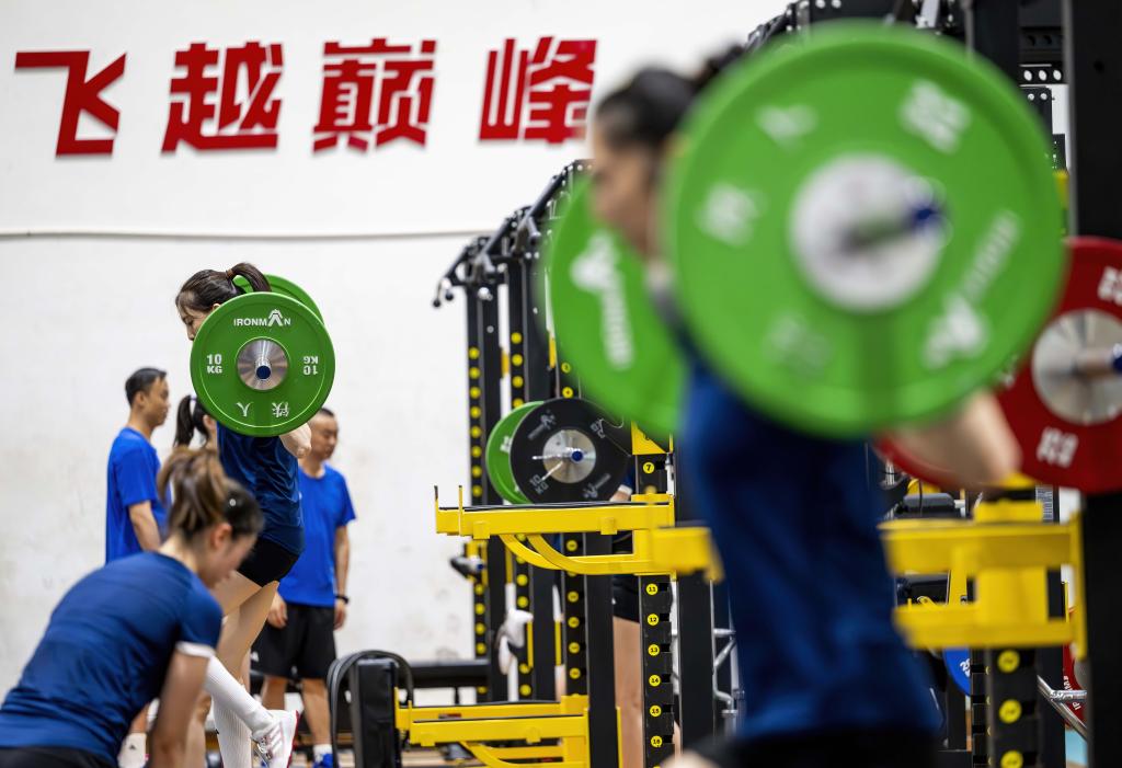 7月13日,中國(guó)女排隊(duì)員在進(jìn)行力量訓(xùn)練。新華社記者 魏培全 攝