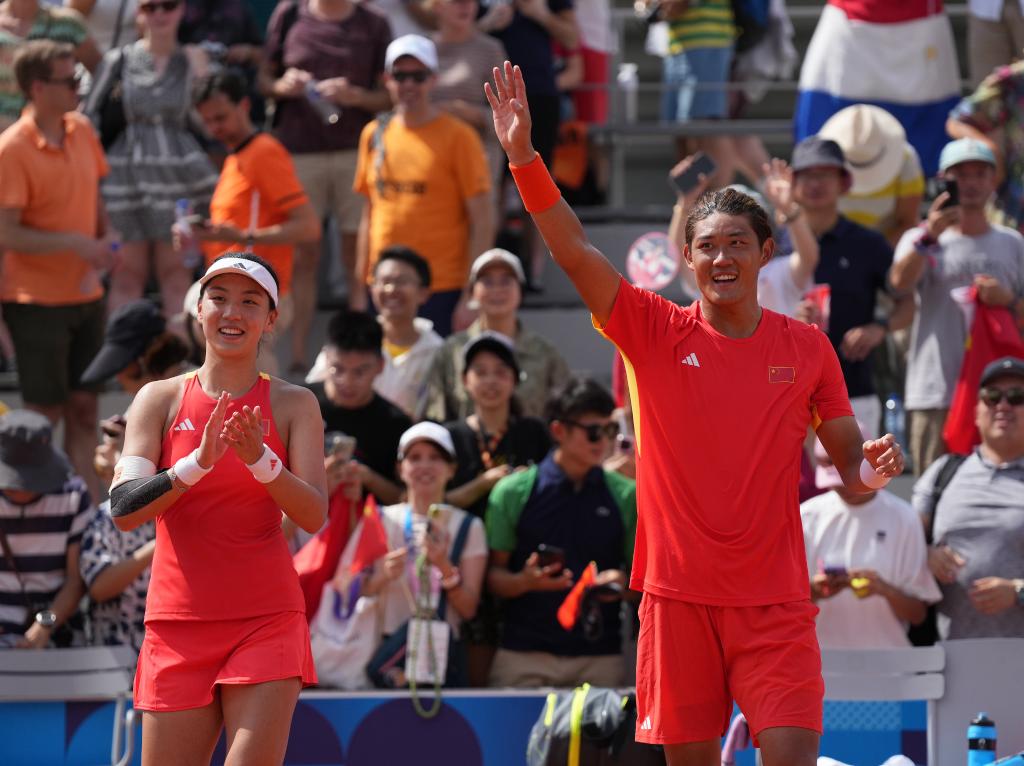 8月1日,王欣瑜/張之臻在網(wǎng)球混合雙打半決賽后慶祝。新華社記者 萬象 攝