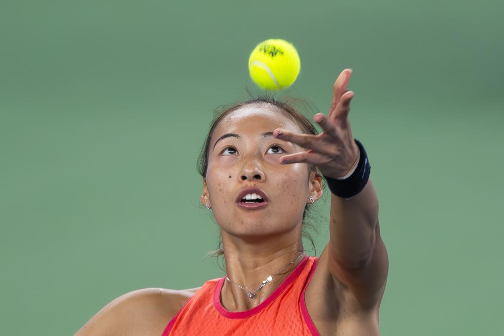 10月11日,鄭欽文在比賽中發(fā)球。新華社記者 肖藝九 攝