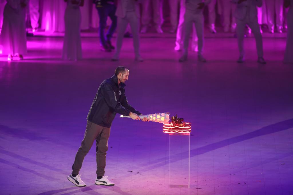 意大利體育和青年部長安德烈亞·阿博迪出席開幕式并宣布運動會開幕。在充滿風情的歌舞、魔術和雜技表演后,意大利足球名宿基耶利尼手持火炬,將一臺無人機“激活”。隨后,發(fā)光的無人機從奧林匹克體育館飛向都靈王宮,將矗立在王宮前的主火炬點亮。